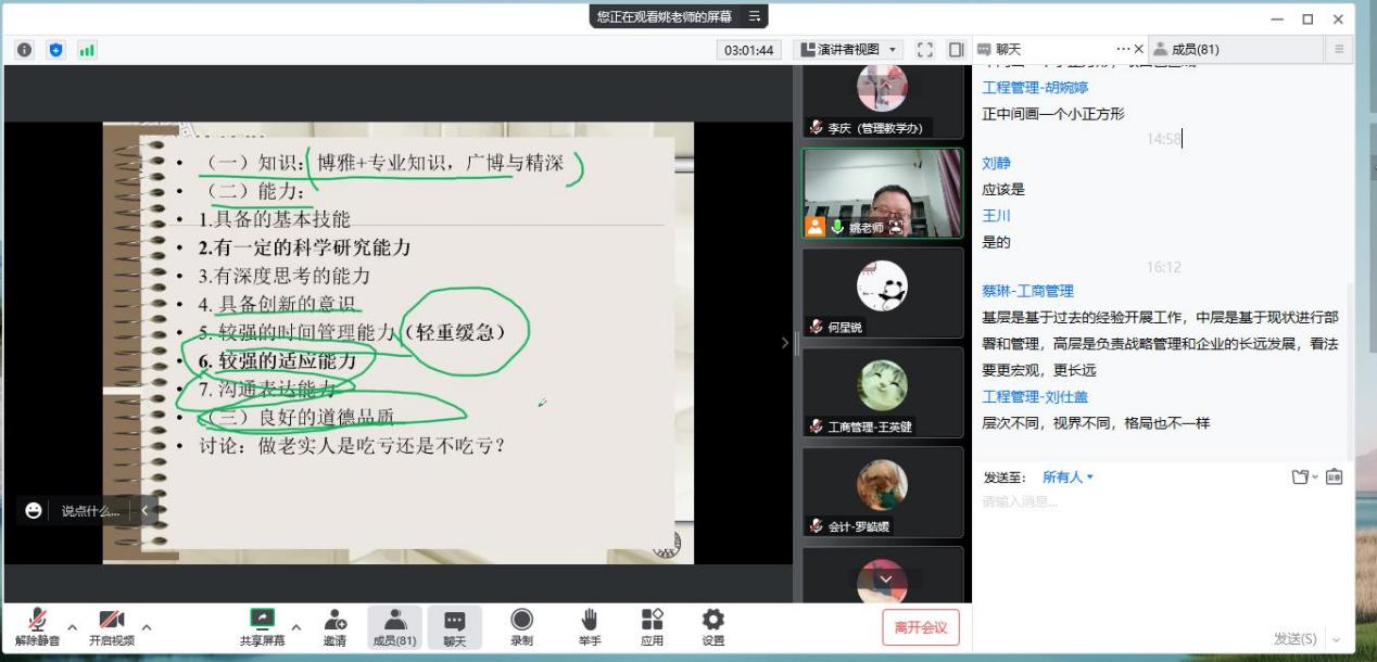 9月16日上午,工商管理系主任丁灿开展弘扬科学家精神专题讲座,丁主任以兰可桢、钱学森等老一辈科学巨星、国家脊梁、民主楷模的故事展开讲解,鼓励2022级研究生发扬淡泊名利、潜心研究的奉献精神。下午,我院副院长姚世斌开展硕士研究生人才培养目标解读,姚院长从学习知识、培养能力、塑造价值等方面开展讲解,要求在注重专业知识广度学的同时也要注意专业知识深度学习,全方位发展个人能力,争做全能“数智”人才。