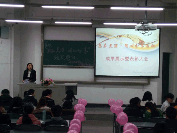 11月19日12:00,管理学院“恩在点滴,用心分享”大型活动成果展示暨表彰大会在6B-104教室拉开帷幕。学院学生工作办公室王映�老师,团委学生会全体成员以及获奖学生参加了此次大会。