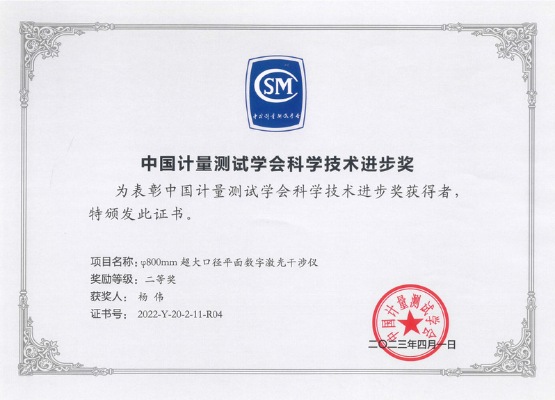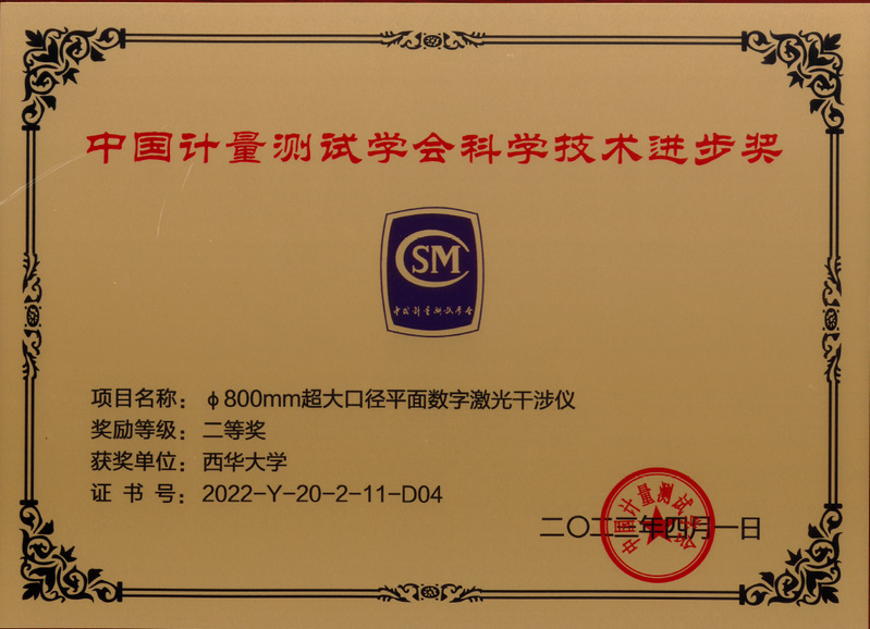 西华大学荣获“2022年度中国计量测试学会科学技术进步奖”二等奖,项目由航空航天学院“智能传感与高速运算研究中心”赵智亮、杨伟老师负责, 项目名称“φ800mm 超大口径平面数字激光干涉仪”。获奖项目由国家市场监督管理总局副局长燕军、湖北省副省长盛阅春、中国工程院院士谭久彬、中国科学院院士舒红兵于2023年05月颁奖,于07月颁发获奖证书。