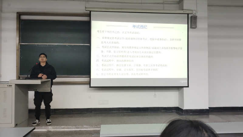 在本次会议中,张焱坤老师首先通过PPT演讲的形式向同学们进行宣讲期末考试的一些注意事项以及考风考纪的重要性,告诉同学们应该树立诚信意识,认清考试舞弊行为的危害性和不可弥补的严重后果,并以让同学们亲自诵读学生手册上的考试违纪处分的处罚细则的方式,让同学们对考风考纪拥有更深刻的了解,树立诚信意识。此外,张焱坤老师还举了一些考生在考试中舞弊后遭到严重的处分的例子,以此告诫同学们,希望同学们能够诚信应考。