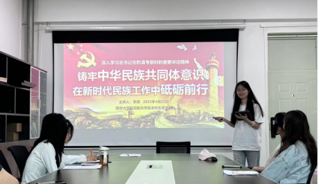 李倩同志以习近平总书记在黔滇考察时的重要讲话精神为主题,深入阐释了铸牢中华民族共同体意识的重要性和深刻内涵,分享了云南和贵州在实践探索中的经验与启示,并提出了实践路径。她要求党员同志们以习近平新时代中国特色社会主义思想为指导,深入贯彻落实中央关于民族工作的决策部署和要求,加强宣传教育引导、推动经济社会发展、加强法治保障建设、坚持党的领导核心作用等方面的工作力度,为铸牢中华民族共同体意识贡献自己的力量。