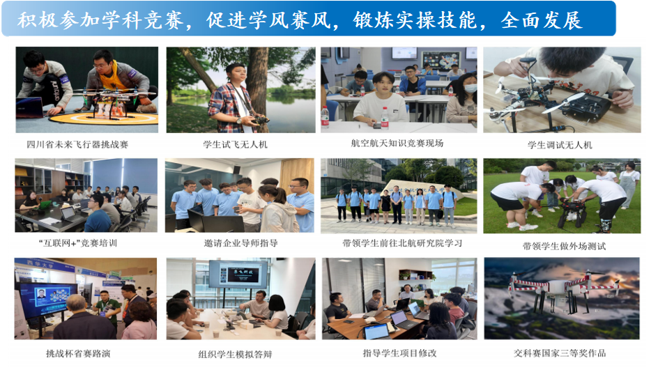 学院在第二课堂活动中推行“学以致用,以赛促学”的教育模式,鼓励学生踊跃参与挑战杯、创新大赛、未来飞行器设计大赛、全国大学生航空航天模型锦标赛等学科竞赛,连续三年荣获中国国际大学学生创新大赛国家级铜奖、四川省金奖,学科竞赛省级以上奖励291人次。