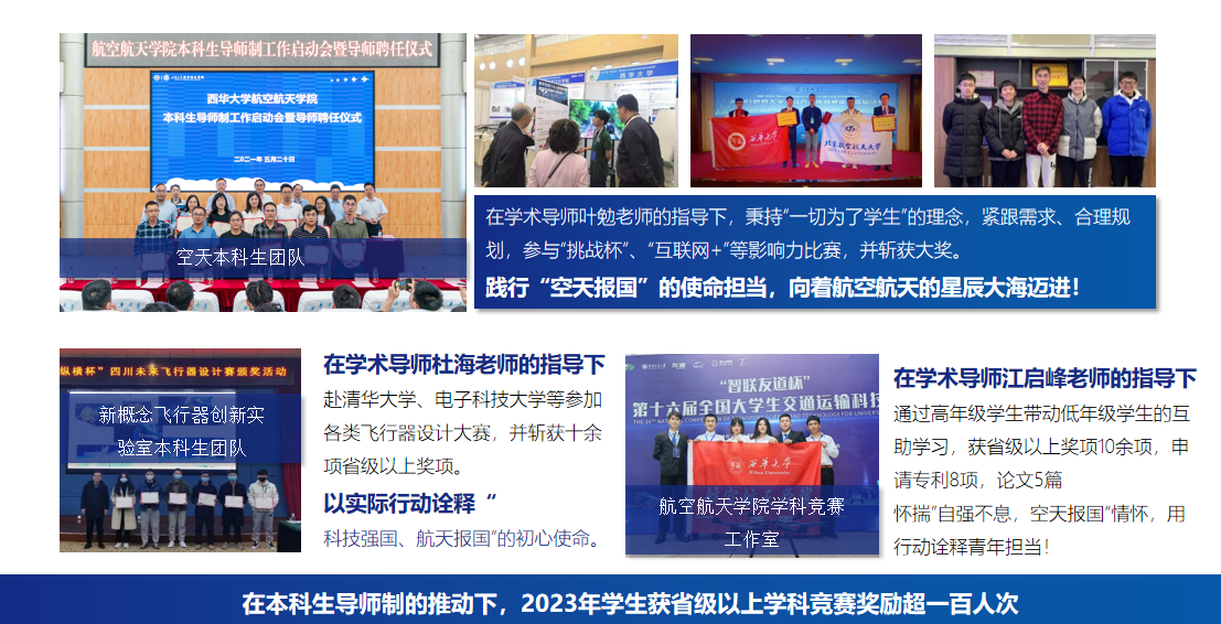 针对新工科人才“厚基础、强能力,高素质、重创新”的时代要求,遵循“精细管理、精准服务,严管厚爱、立德树人”的学生工作理念,打造“空天之光”学生工作品牌。实施“辅导员+学业导师+学术导师”全师生覆盖、全阶段衔接、多维度融合的学科交叉融合本科生导师制,带领学生进团队、进课题、进实验室,积极在第二课堂活动中推行“学以致用,以赛促学”的教育模式,鼓励学生踊跃参与挑战杯、创新大赛、未来飞行器设计大赛等学科竞赛。