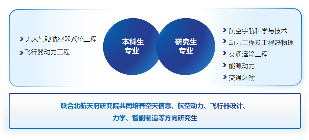 学院以面向空天、科教融合、国际接轨、创新发展为办学理念,以打造航空航天领域的高质量人才培养基地和高水平科研创新基地,建设成为省内一流、国内知名的航空航天学院为发展目标;统筹协调专业发展,强化无人驾驶航空器系统工程、飞行器动力工程专业;立足四川、辐射西部、服务地方经济社会发展,培养面向无人机、通用航空产业的专业基础扎实、工程实践能力强、综合能力突出、富有创新精神,具有空天报国情怀的应用型、复合型高级专门人才。