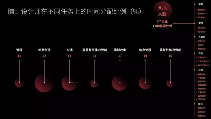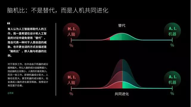报告在设计和人工智能的讨论中避免使用隐喻威胁的“替代”概念,而提出“脑机比”(即人脑与机器的比例)的概念:对于很多工作,也许会由于机器的成分越来越大,所以人脑的成分会越来越小,因此脑机比无限小,人类的价值无限小。而另一些工作,即使机器成分变大,人脑也在变大,甚至机器的成分越大,也会造成人脑的进化甚至释放。设计肯定属于后者。