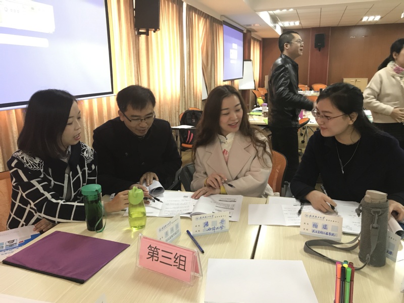 工作坊第二天,在李纹霞、陈圆、刘皓及武汉轻工张胜全、胡淑均、曾万勇、詹薇等获得FDW培训资质的带领员的引导下,进行了基于有效教学结构BOPPPS的小组微型课程演练与回馈。所有参训教师分成七个小组,每个小组每人进行10分钟微格演练,随后小组成员互评的方式,帮助老师们更好的认识自己的优势和不足,并不断的改进提高。