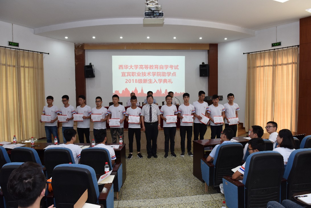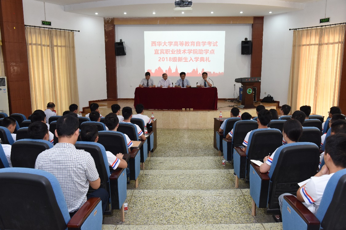 在入学典礼上,阮永生院长首先代表学院向宜宾职业技术学院的老师和2018年注册的新生表示热烈的欢迎,为同学们有追求更高目标的精神和勇气表示鼓励,他简要地介绍了西华大学的历史、学校办学条件、办学目标和办学社会效果;从自考来历、社会认可度和参加自考的重要性三个方面,详细地介绍了高等教育自学考试,并从就业、毕业后工资待遇、人事改革、考研、考职业资格证、留学、评定职称和其他等八个方面讲述自考取得本科毕业证的重要性。阮院长讲到我校继续教育长期以来贯彻“以社会需求为导向,以办学特色求发展,以办学质量树品牌”办学方针,坚持创新发展。希望同学们积极主动学习、鼓励更多的在校生能利用专科学习的业余时间,努力勤奋学习本科课程,完成本科学业。要求助学点规范教学、主办单位做好助学服务工作,愿大家在这样的平台上脚踏实地、坚持不懈,不畏工科的难度,争取早日学成毕业。李恩田主任感谢西华大学对宜宾职业技术学院一直以来的支持关心和帮助,望同学们珍惜学习机会,争取在这个自考平台的基础上,努力拼搏,向着更高更远目标前进,考上研究生。