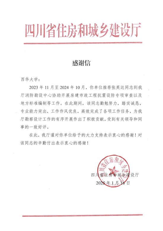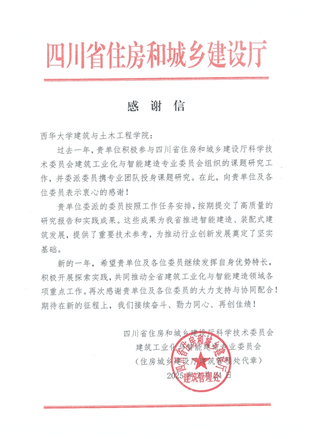 四川省住房和城乡建设厅在感谢信中特别提到:“贵单位委派的委员按照工作任务安排,按期提交的研究成果,为我省推进智能建造、装配式建筑发展,提供了重要技术参考,为推动行业创新发展奠定了坚实基础。”“张英达同志专业能力突出,高效完成了各项工作任务,为我厅勘察设计工作的有序开展做出了积极贡献。”