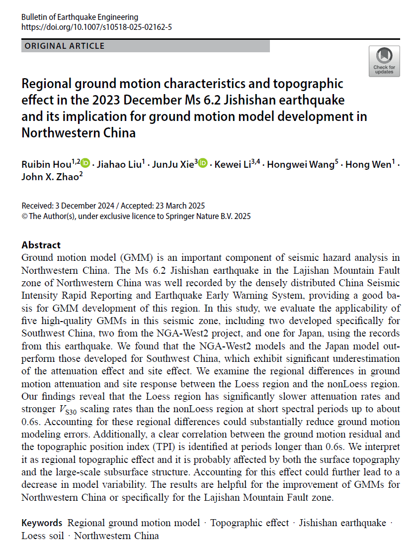 近日,建筑与土木工程学院道路与桥梁工程系青年教师侯瑞彬以第一作者再次在欧洲地震工程协会官方出版期刊《Bulletin of Earthquake Engineering》(中科院二区,IF=4.1)上发表学术论文。论文题目为《Regional ground motion characteristics and topographic effect in the 2023 December Ms 6.2 Jishishan earthquake and its implication for ground motion model development in Northwestern China》,西华大学为第一单位,侯瑞彬老师为第一作者,我校2022级本科生刘家豪为第二作者,中国地震局地球物理研究所谢俊举研究员为通讯作者。