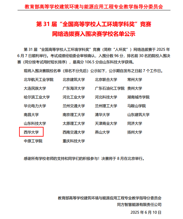 2025年6月7日,第31 届“全国高等学校人工环境学科奖”竞赛(简称“人环奖”)网络选拔赛结果揭晓。西华大学建筑与土木工程学院2022级建筑环境与能源应用工程专业张煜康同学在网络选拔赛中取得佳绩,获得决赛入围资格,将于今年8月前往清华大学参加决赛。