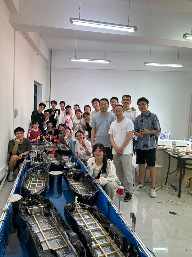 轻巧过关显功底:“国阳大队”( 队员:唐伟峰、王枭、刘国阳,指导老师:邹宇)凭借轻巧灵动的船只设计,成功通过了关键的三级静载测试,展现了扎实的基本功。