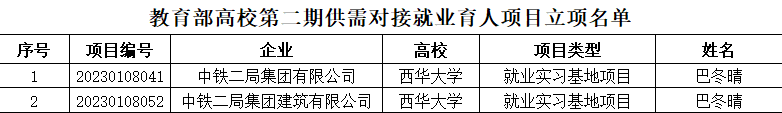 近日,教育部公布了第二期供需对接就业育人项目立项名单。根据《教育部高校学生司关于公布第二期供需对接就业育人项目立项名单的通知》(教学司函〔2023〕6号),西华大学共计10个项目获批立项,其中建筑与土木工程学院辅导员巴冬晴老师立项2项。