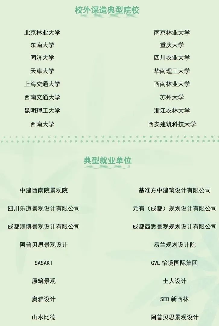风景园林是四川省高等院校中办学历史较早、整体实力雄厚、社会影响较广的专业。专业拥有一支具有美国伊利诺伊大学厄巴纳-香槟分校、比利时根特大学、同济大学、中科院等国际国内知名高校博士学位的专任教师团队。专任教师中拥有博士学位和高级职称人数超过2/3。专任教师近五年主持国家级、省部级等项目超过40项,发表高水平论文超过40篇。本专业具有健全的本科—硕士培养体系,设有风景园林专业硕士学位点,并与意大利米兰理工大学、意大利罗马一大、美国爱达荷大学有深度交流合作项目。学生多次获得国际国内景观规划设计大奖。专业紧贴国家生态文明建设战略需求,依托大土木学科集群优势,促成“设计为先,技术为基,产学一体”的新工科本科生培养机制。毕业生除考入国际知名高校、985、211高校继续深造外,主要进入中铁、西南设计院等国企、央企以及景观设计行业知名公司。