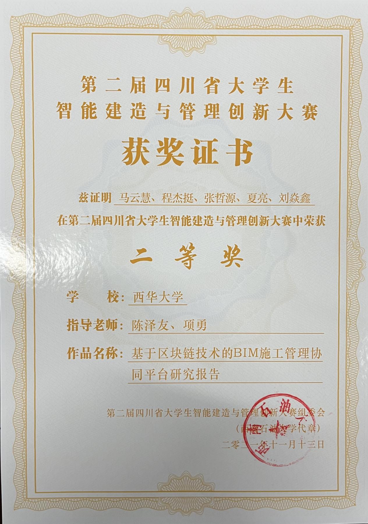 近3年来,工程管理专业同学在指导老师带领下,获得了全国三维数字化创新大赛特等奖1项,品茗杯全国BIM应用毕业设计大赛一等奖若干项,四川省智能建造与管理创新大赛二等奖4项,全国房地产策划大赛一等奖6项。