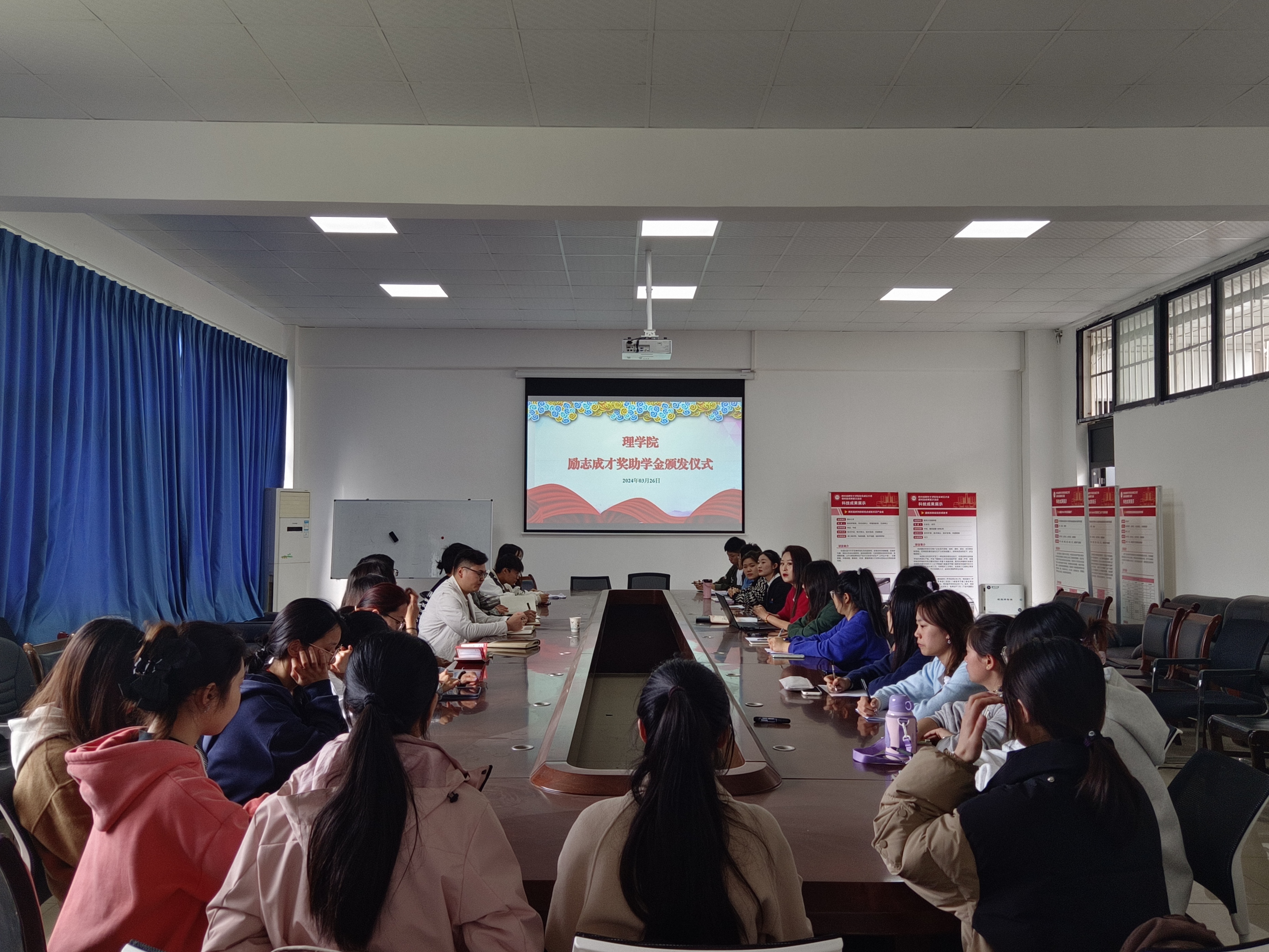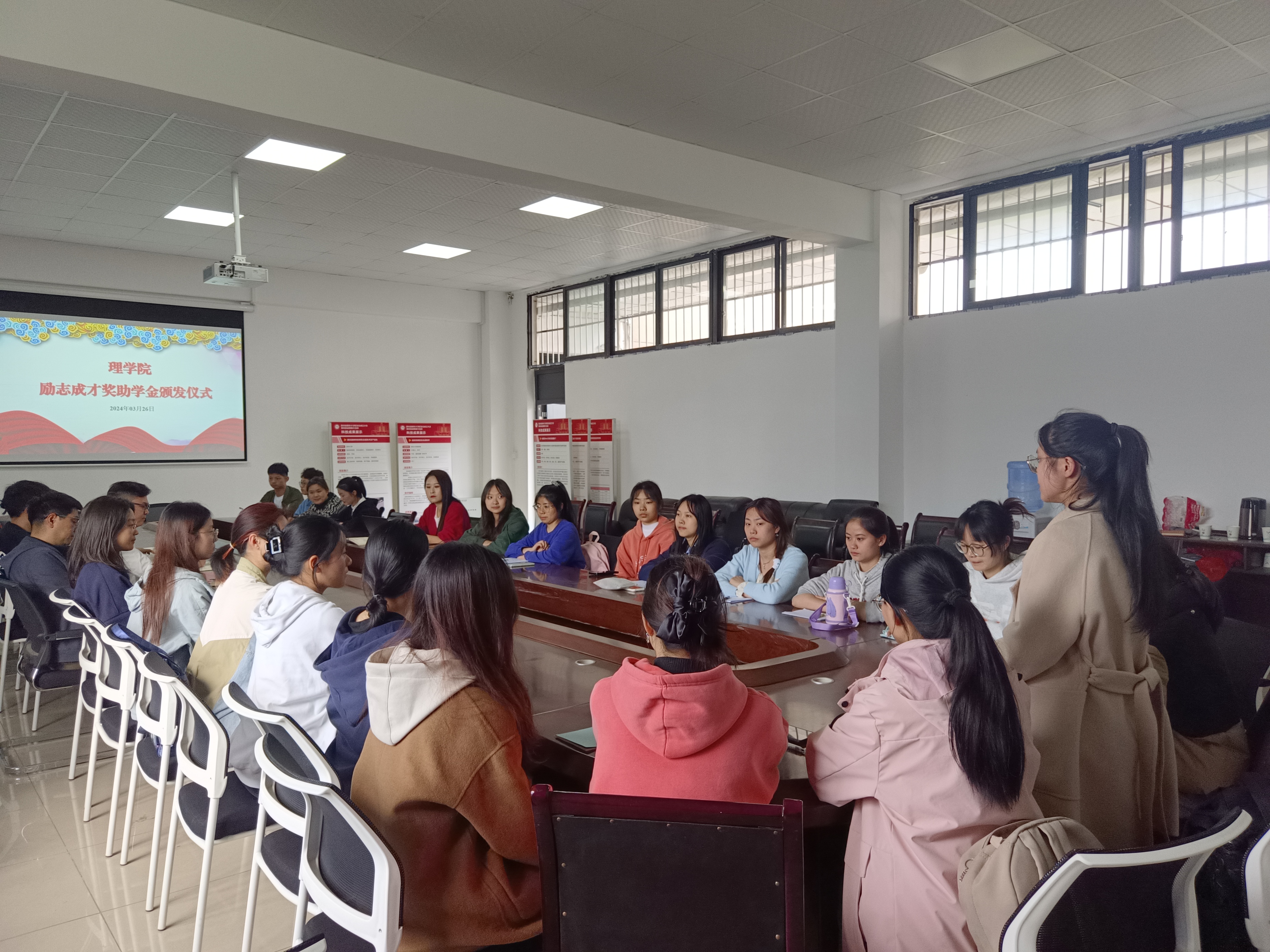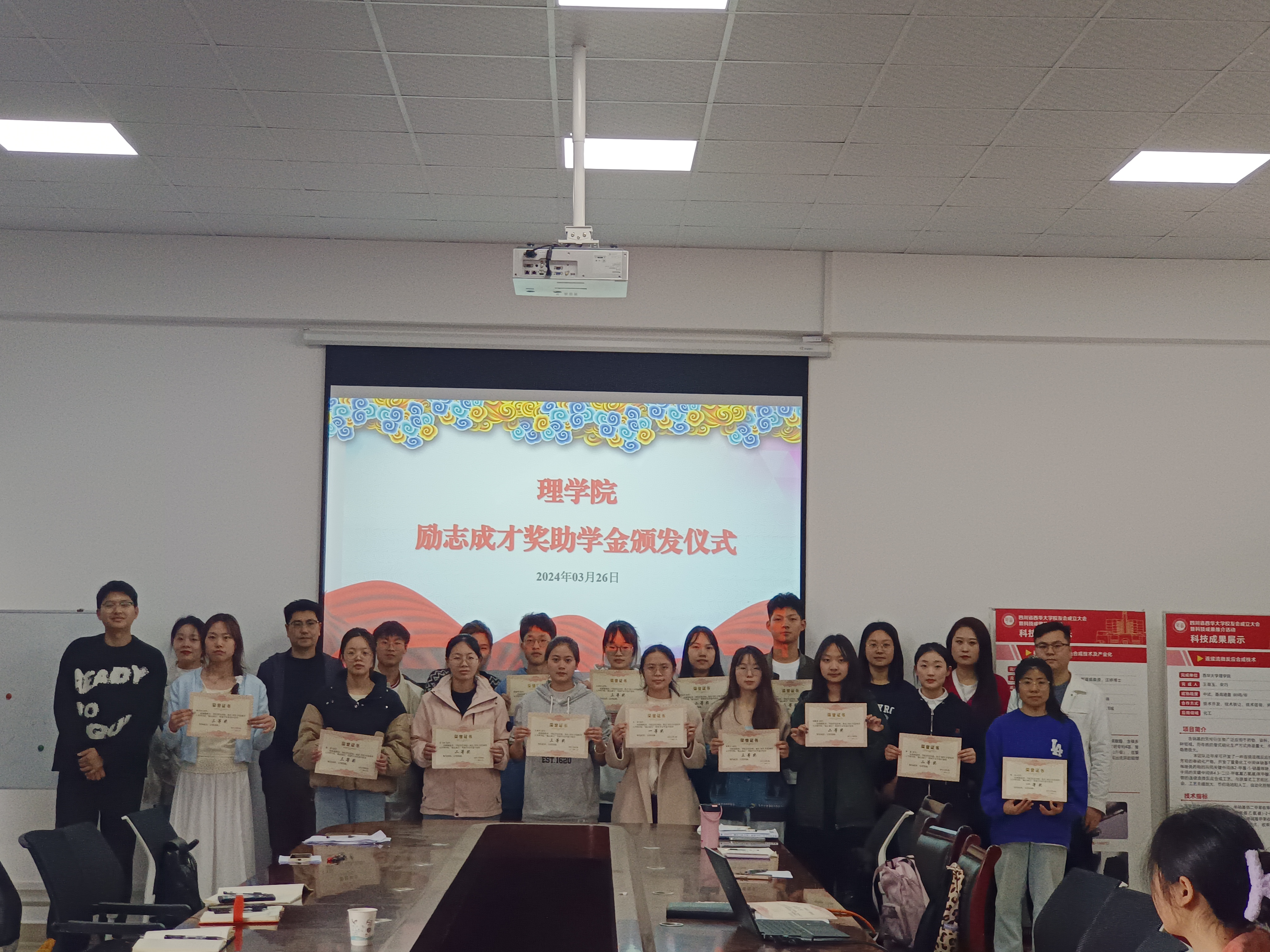 3月26日下午,理学院在2B-408举行“励志成才奖助学金颁发仪式”。本次颁奖仪式由学院学工办主任欧玥主持,理学院党委副书记兼纪委书记周川,团委书记蒲小敏,专职辅导员以及相关同学出席本次颁奖仪式。