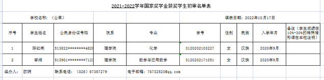 经学生本人申请,评议小组认真评议,学院评审委员会初审,拟上报李湘等2名学生作为2021-2022学年度国家奖学金的初选人选,详情见下表,特此公示,公示期为2022年10月17日至2022年10月21日。