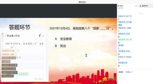 会上,首先通过理论讲解和观看视频的方式学习了《习近平:坚持走中国特色社会主义道路,更好推进中国特色社会主义法治体系建设》和《习近平:不断做强做优我国数字经济》。紧接着,围绕时事政治、所学理论,依托学习强国题库开展党史知识问答活动。该活动以抢答的方式进行,参会的同志都积极踊跃地通过发弹幕的形式作答。