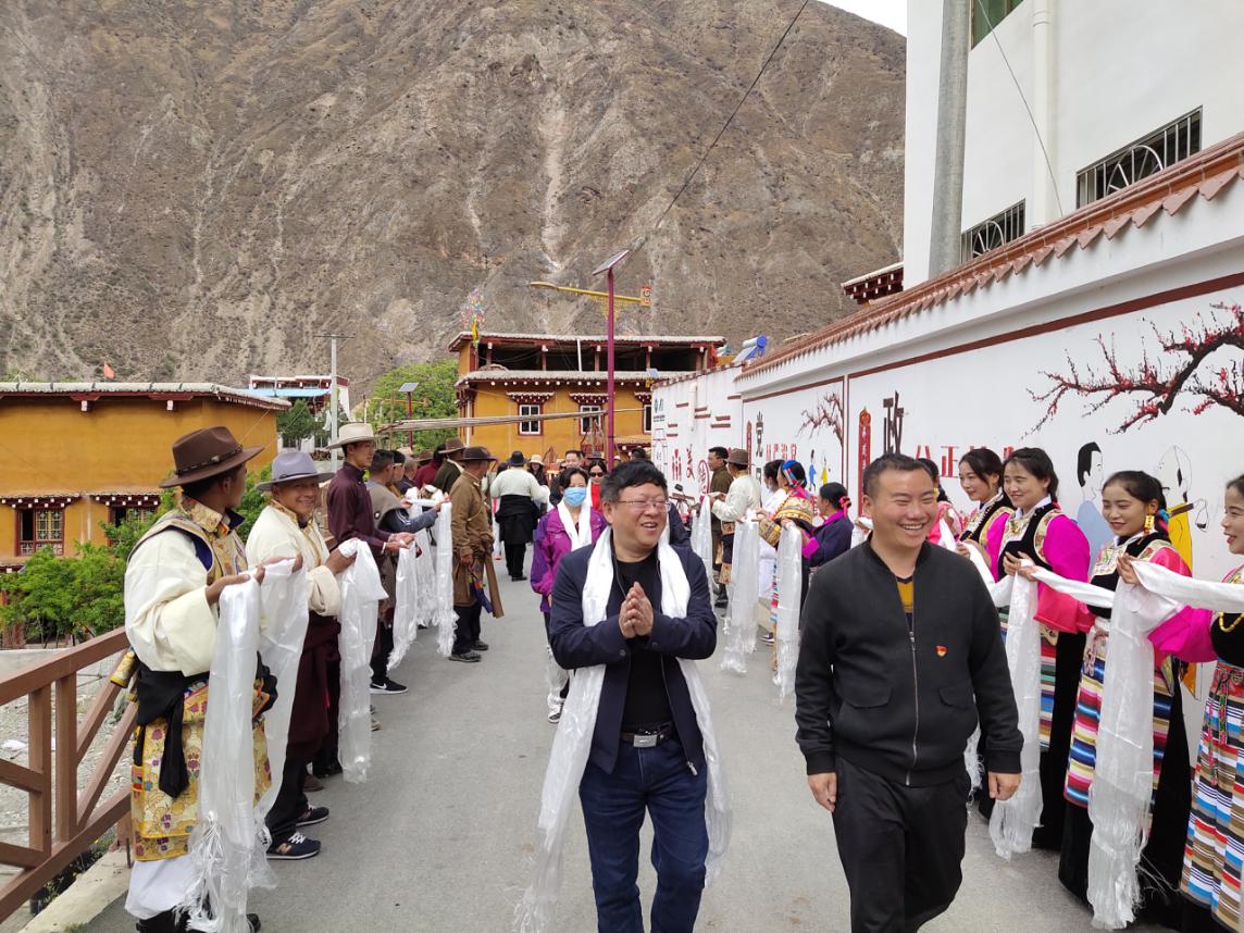 走访受灾户后,刘小兵一行前往水磨沟村活动室,在通往村会议室道路两旁,两村村民自发组织起来,身着民族盛装欢。随后,两村村民在水磨沟村活动室院坝跳起欢迎最尊贵客人的巴塘弦子,以此感谢西华大学长期以来倾智、倾情、倾力的帮扶,也寓意在我校帮扶下两村未来发展的良好前景。活动期间,水磨沟、列布西村受灾户代表阿丁和小甲错向西华大学送上锦旗,表达真诚的感激之情。