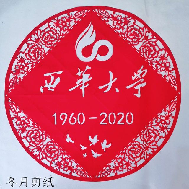 2020年是西华大学建校60周年,疫情期间,除了抗疫系列剪纸,汪孝君还制作了一套西华系列的剪纸,打算献礼西华大学60周年校庆。这套西华系列剪纸不仅包括校徽、各个教学楼、标志性建筑物,还包括了各学院的院徽,总计有50多幅。