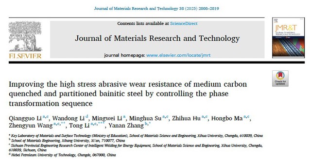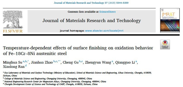 近日,材料科学与工程学院王正云教授团队苏明华博士、李强国副研究员在《Journal of Materials Research and Technology》(IF=6.6)分别发表题为“Temperature-dependent effects of surface finishing on oxidation behavior of Fe-18Cr-8Ni austenitic steel”和“Improving the high stress abrasive wear resistance of medium carbon quenched and partitioned bainitic steel by controlling the phase transformation sequence”的研究论文。西华大学为第一完成单位,王正云教授为共同通讯作者。