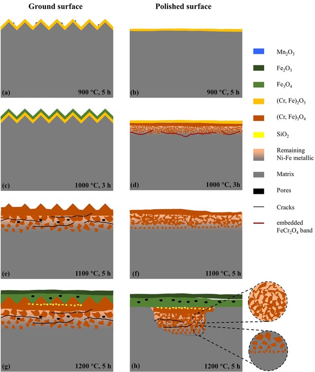 Fe-18Cr-8Ni奥氏体钢因其价格低廉、制造工艺成熟以及优异的机械性能,尤其是高温下良好的抗氧化性,广泛应用于能源、核电等领域,但传统安全服役温度上限约为900°C,超1000°C后氧化性能下降。研究团队聚焦“表面研磨”这一低成本表面处理工艺,开展了研磨与抛光试样在N2-21vol% O2气氛,900-1200 °C温度下的短期高温氧化实验。结果表明,表面研磨对氧化性能的影响呈现显著的温度依赖性:在900°C时,表面研磨加速了Cr的向外扩散,有利于富Cr氧化层的更快形成,研磨试样的抗氧化性优于抛光试样。当氧化温度≥1000 ℃时,随着表面粗糙度的增加,富Fe氧化层更快形成,内部氧化加剧,抛光试样的抗氧化性优于研磨试样。这项工作对于不同高温服役场景下钢材表面处理方案的选择具有重要的理论指导意义。