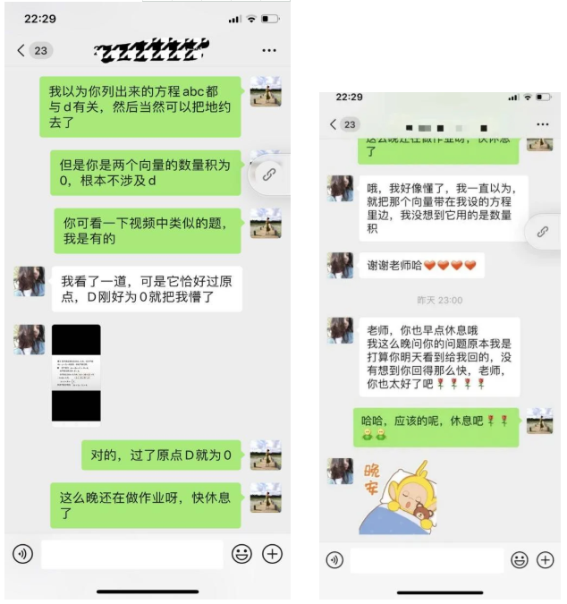 因为是网上教学,所以要更加关心学生。昨天晚上已经比较晚了,有一个同学发信息来问一道题,我立刻回答了他。后来这个同学很感动,他说:“朱老师,你真的太好了!”