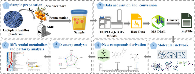 本研究系统探究了植物乳杆菌发酵沙棘-牛奶体系的代谢组变化,旨在发掘新型生物活性成分并提升其营养与感官特性。针对传统数据库驱动方法在代谢物注释方面的局限性,本研究构建了一种整合特征分子网络(FBMN)、深度学习工具DeepMass v2及人工质谱解析的代谢组学工作流,全面解析了发酵过程中非挥发性代谢物的动态演变规律。该策略拓展了对沙棘化学成分的现有认知,新发现了包括异戊酰化黄酮醇苷与四氢哈曼-3-羧酸在内的多种代谢物,并揭示了其潜在的生物合成路径。