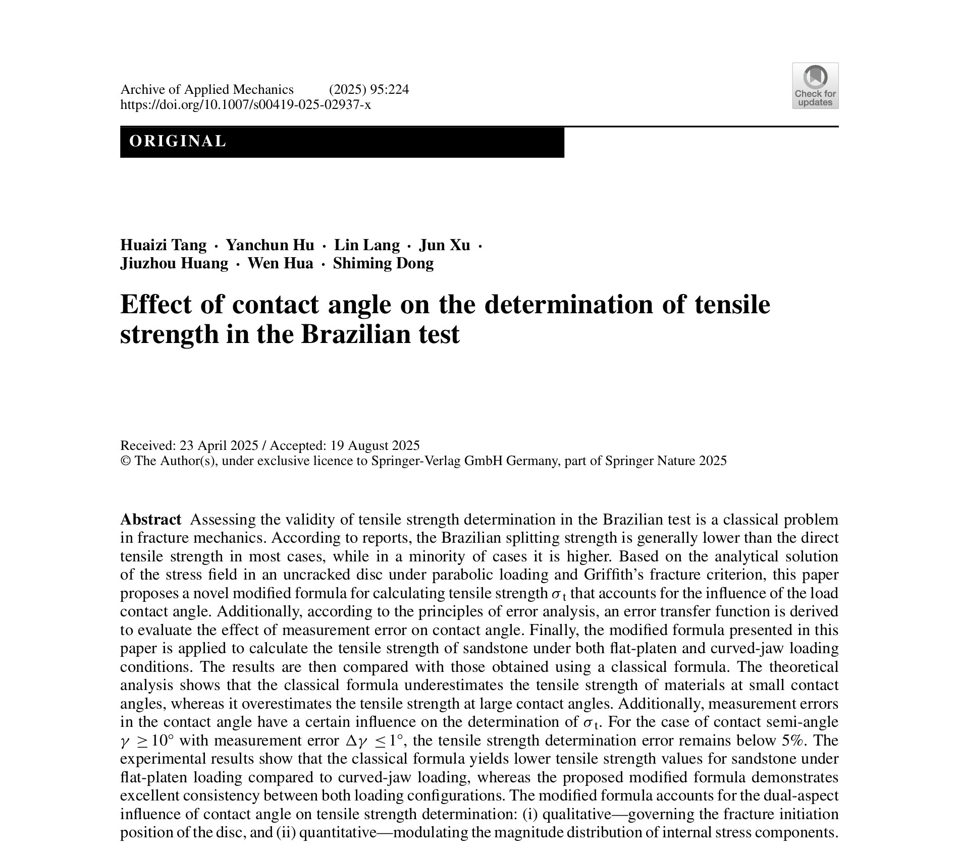近日,建筑与土木工程学院材料与结构动力学创新研究团队在国际知名期刊《Theoretical and Applied Fracture Mechanics》(JCR一区、中科院二区TOP,IF=5.6)和《Archive of Applied Mechanics》(JCR二区、中科院三区,IF=2.5)分别发表题为“Effect of contact angle on the determination of mode I and II fracture toughness in the Brazilian test: Theory and experiment”和“Effect of contact angle on the determination of tensile strength in the Brazilian test”的系列研究成果。西华大学为论文第一单位,建筑与土木工程学院郎林副教授为通讯作者,团队汤淮子博士为第一作者、徐军博士为参与作者。