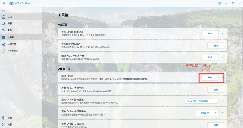 使用学校的Office授权工具激活办公软件时,若无法正常激活,请先下载Office Tool工具箱,按照下图所示,彻底移除本机原有的Microsoft Office软件,然后再使用学校提供的Office安装镜像进行安装,最后再激活即可。
