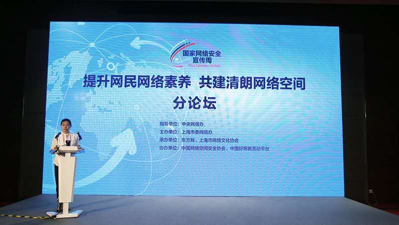 9月19日上午,由中央网信办指导,上海市委网信办主办,东方网、上海网络文化协会承办的2017国家网络安全宣传周“提升网民网络素养 共建清朗网络空间”分论坛在上海举办。本次论坛旨在探讨深入开展网民网络素养教育工作的有效途径,引导网络社会各方主体共筑网络安全防线,共建清朗网络空间。来自中央网信办、教育部、全国总工会、团中央、全国少工委、全国妇联等部委有关部门负责同志,专家学者、地方网信办代表、网络社会组织、网络文化企业、上海市有关部门及青年学生等共计200余名代表参加了论坛。
