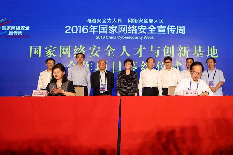 在国家网络安全人才与创新基地重点项目签约仪式上武汉市政府和周大福企业有限公司签署协议。(中国网信网 焦鹏 摄)