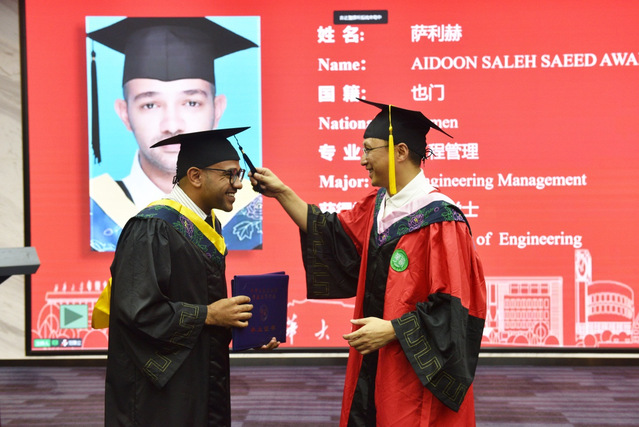2022届工程管理专业萨利赫(也门)同学代表国际学生毕业生发言,他表达了对中国的热爱之情,讲述了在西华四年的留学经历,并衷心感谢学校、老师对他的培养与帮助,以及同学们给予他的支持与关心。他尤其被疫情期间中国人民的团结与奉献精神所感动,并为自己配合防疫规定做出的努力感到自豪。