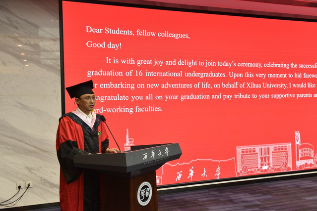 典礼开始,罗擘院长代表刘树根校长宣读了对毕业生的致辞,在致辞中,刘校长将西华的六字校训“求是、明德、卓越”赠与2022届全体国际学生毕业生,表达了离别时刻的不舍和对同学们寄予的厚望,并欢迎大家在疫情过后能回西华看看。