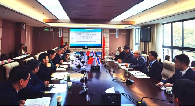 韦纳友执行副校长肯定了两校长期开展的教育合作,并对两校未来的合作进行了展望。同时,泰方人员也还介绍了西华大学曼谷易三仓校区的学生注册情况,对未来西华大学曼谷易三仓校区的招生工作安排、以及课程保障等进行了汇报。克迪副校长表示,易三仓大学将积极支持西华大学曼谷易三仓校区的招生工作以及师资保障,将充分利用两校优势资源,培养符合中泰发展的综合型人才。