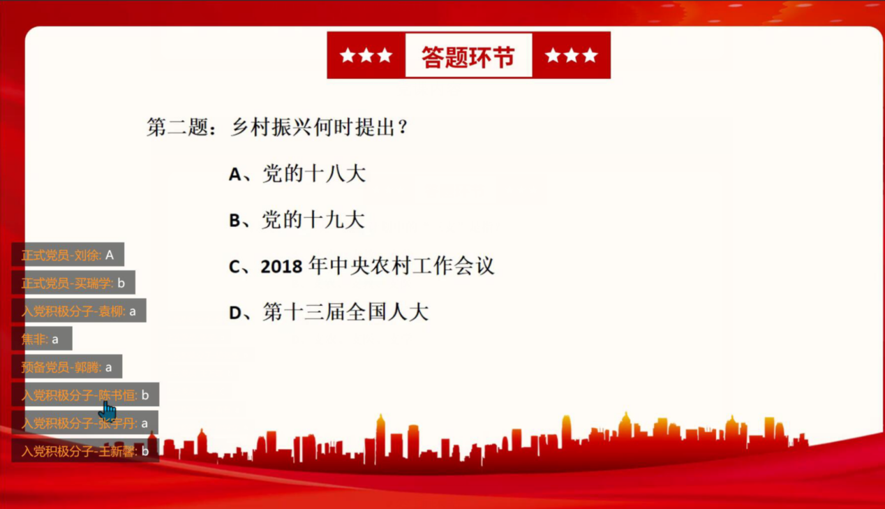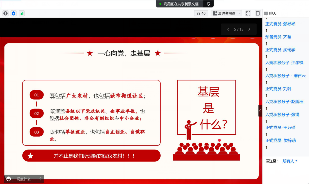 首先,支部书记贾海燕以“乡村振兴大背景下的个人选择——一心向党,走基层”为主题,带领大家认真学习了党的十九大作出的乡村振兴战略这一重大决策部署。并详细讲解了基层就业的相关知识和国家政策,使得各位同志更加了解国情,了解社会,正确认识就业形势,树立行行建功,到处立业的观念,踊跃到基层锻炼成才。随后,围绕党课所讲内容,进行了知识问答环节。支部成员通过发弹幕的形式,积极踊跃参加,促进对此次党课知识的理解和深化。