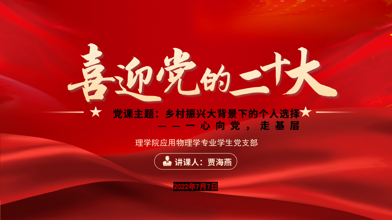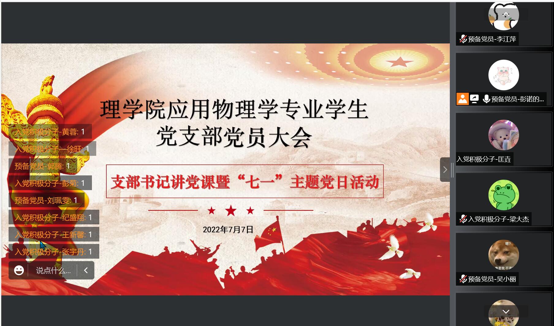 值建党101周年之际,为迎接党的二十大胜利召开,7月7日,理学院应用物理学专业学生党支部通过腾讯会议APP,在线上开展了支部书记讲党课暨“七一”主题党日活动。活动由支委成员主持,支部书记贾海燕担任主讲人,支部全体党员同志、入党积极分子参加。