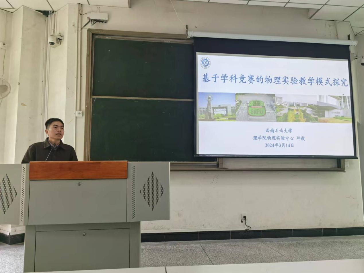 3月14日下午,西南石油大学理学院物理实验中心主任邱毅博士应邀在4A202进行“基于学科竞赛的物理实验教学模式探究”主题讲座,讲座由理学院物理系主任付佳主持,副院长李会东,物理系与物理实验中心相关教师、2021级、2022级和2023级应用物理学专业学生参加。