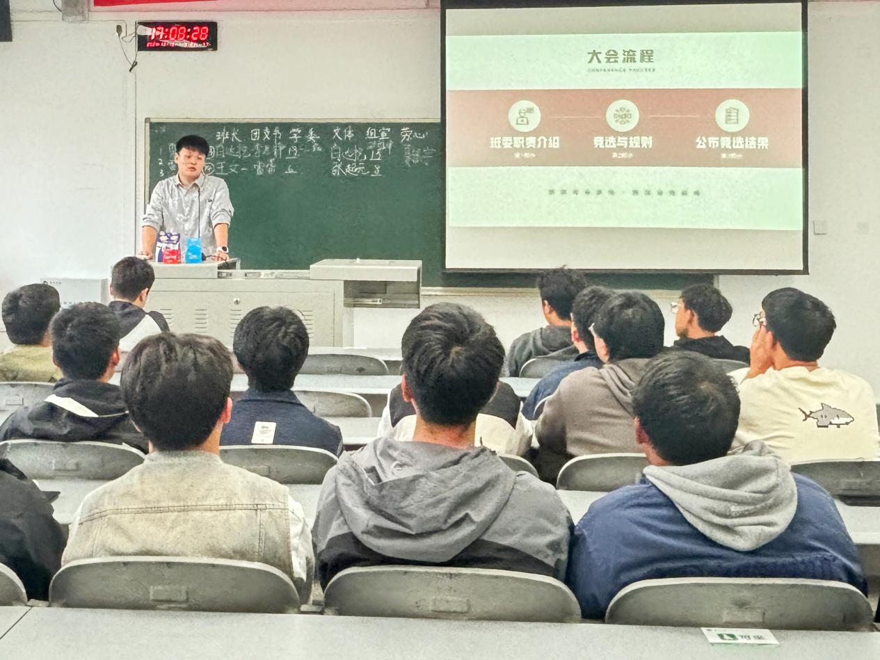 会上,同学们从个人履历、竞选优势和个人兴趣特长等方面展开了班委竞选宣讲,承诺将保持初心、服务学生、齐心协力共创班级新局面。随后,范志祥老师结合培养方案和人才培养特色,勉励同学们珍惜大学时光,明确学习目标,以学为乐、以梦为伴,要志存高远、好学善思,在学思践悟中练就担当作为的真本领。程路老师结合专业发展,激励各位新生要坚定成长目标,做好大学规划,勇于探索,以饱满的热情和坚定的信念迎接未来的挑战和机遇。辅导员鲁鹏老师提醒同学们要时刻保持警惕,提高安全意识,筑牢安全防线。