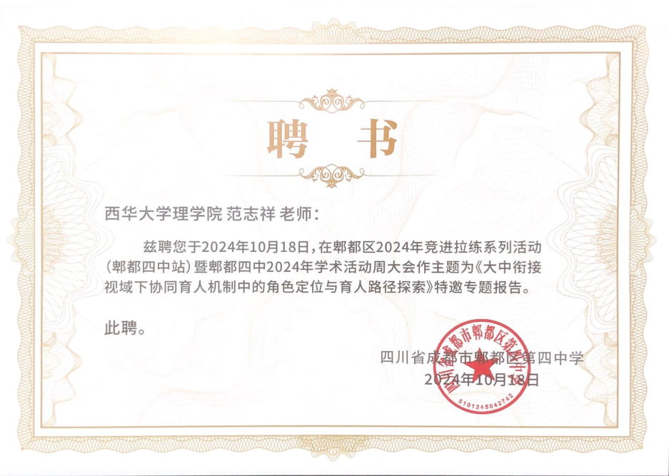 10月18日,在成都市举办的高质量课堂赋能高质量教育主题研讨暨郫都区2024年竞进拉练系列活动(郫都四中站)中,理学院副教授范志祥受邀出席,并作题为《大中衔接视域下协同育人机制中的角色定位与育人路径探索》的大会报告。