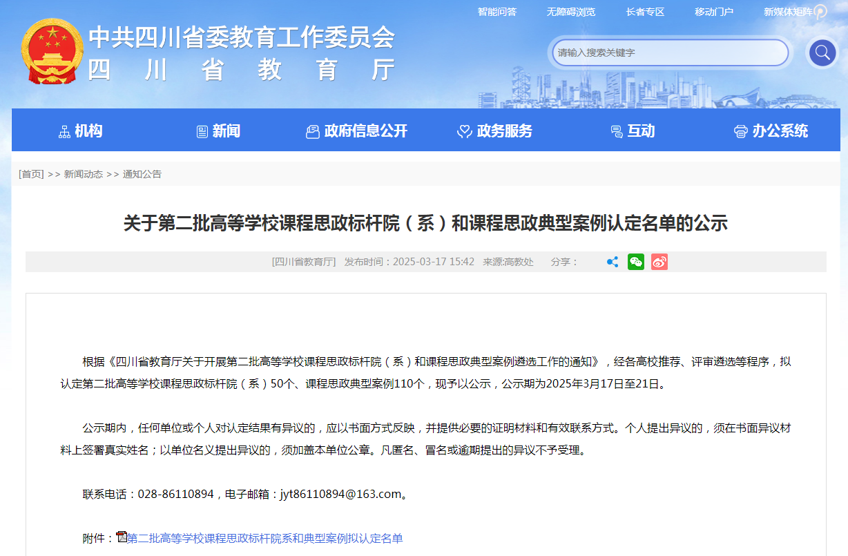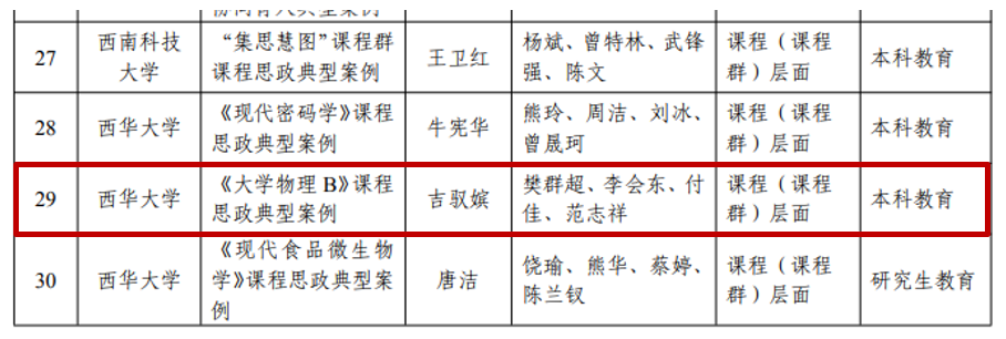 近日,四川省教育厅对第二批省级高等学校课程思政典型案例认定结果进行了公示,我院“《大学物理B》课程思政典型案例”获评为四川省高等学校课程思政典型案例。