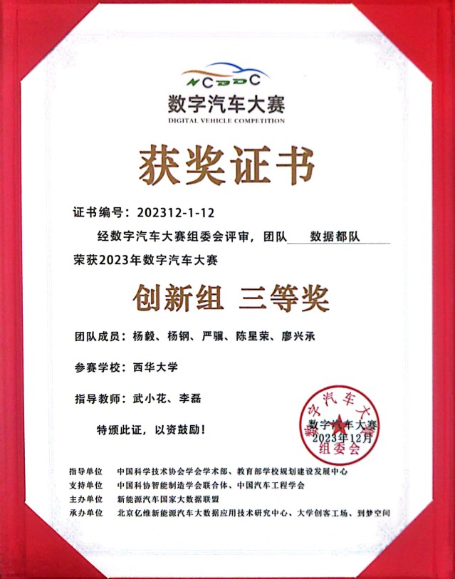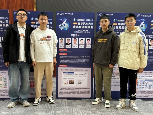 2023年12月23-24日,第六届数字汽车大赛全国总决赛在广东省佛山市南海区千灯湖创投小镇圆满落幕,西华大学在该项赛事首次进入决赛并斩获佳绩。在武小花、李磊老师的精心指导下,汽车与交通学院学生团队杨毅、杨钢、严骥、陈星荣、廖兴承晋级总决赛,团队参赛作品《基于充电数据的电池健康状态及剩余使用寿命预测》获得“数字汽车大赛创新组三等奖”。