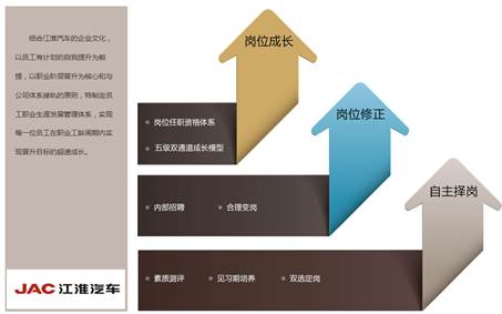 员工分为专业类、市场类、技术类、管理类,根据规范的任职体系,员工可在本类别进行成长(一级至五级),也可以通过内部招聘,合理变岗,表现优秀的可晋升为管理类干部。