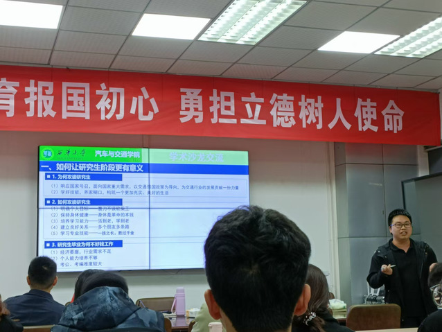 余静财的研究方向为出行行为建模与分析、道路交通安全等。他首先从为何攻读研究生、如何攻读研究生、研究生毕业为何不好找工作等三个问题入手,告诫同学们在研究生学习阶段,要明确自己的目标,并为之不懈奋斗。接着分享了自己的相关研究成果。