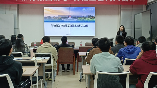 马李京的研究方向为智能交通系统、交通大数据。她作了题为“驾驶行为与交通系统深度建模及仿真”的学术报告,让在座的同学们对跟驰模型和建模与仿真有了更深刻的了解。