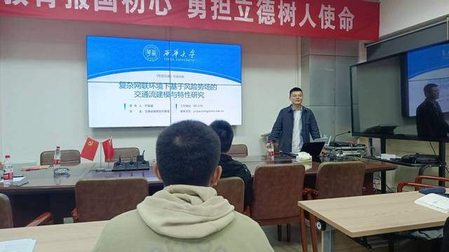 尹嘉诚博士的研究方向为复杂网联环境下的交通流建模与分析,具体包括复杂交通风险表征,车辆运动行为建模,宏观交通流演化分析等。他给同学们作了题为“复杂网联环境下基于风险势场的交通流建模与特性研究”的学术讲座,分享了他在该领域的研究成果。