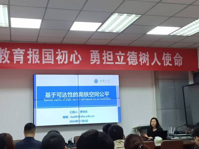 罗欢欢的研究方向为交通地理与经济、交通网络分析、交通行为分析等。她作了题为“基于可达性的高铁空间公平”的学术讲座。她重点讲述了高铁网络可达性和高铁网络空间公平,其研究的意义是为高铁网络优化、高铁运营政策提供科学的合理的决策依据。此外,她还给同学们分享了一些数据的来源地址及数据处理的方法,为同学们处理类似问题的时候提供了宝贵的经验。