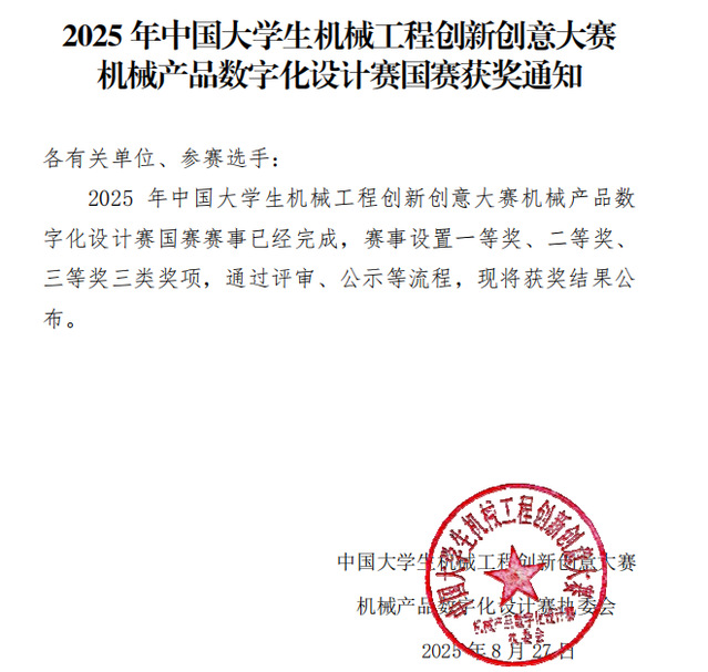 8 月 21 日至 22 日,2025 年中国大学生机械工程创新创意大赛 —— 机械产品数字化设计赛全国总决赛在南昌大学圆满落幕。作为教育部公布的 84 项全国普通高校学科竞赛之一,本届赛事吸引了全国 2500 余件优秀作品同台竞技,汇聚八大赛区顶尖高校团队,竞争激烈程度再创历史新高。西华大学参赛团队凭借卓越的创新思维、扎实的专业功底及紧贴产业前沿的设计方案脱颖而出,最终斩获国家一等奖 1 项、二等奖 1 项、三等奖 2 项的优异成绩,充分彰显学校在机械工程领域的学科实力与创新人才培养的丰硕成果。