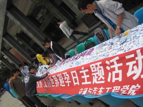 9月25日中午,由成都中医药大学发起,我校交通与汽车工程学院承办的以“爱要负责,支持世界避孕日”为主题的避孕宣传活动在三食堂门口顺利举行。