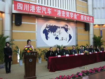 12月25日下午,四川港宏企业管理有限公司为奖励交通与汽车工程学院自强奋斗的优秀学生的“港宏奖学金”颁奖典礼在四教报告厅隆重举行。港宏集团副总裁安藤永一、经营企划部经理徐晓东、港宏别克总经理谭红岗、港宏新通总经理邓建军、港宏新通维修站站长朱江等一行九人出席了典礼。校党委副书记曾德祥、学工部部长王政书、汽车学院院长黄海波、学院党总支书记魏远文等领导以及汽车学院部分优秀学生参加此次典礼。