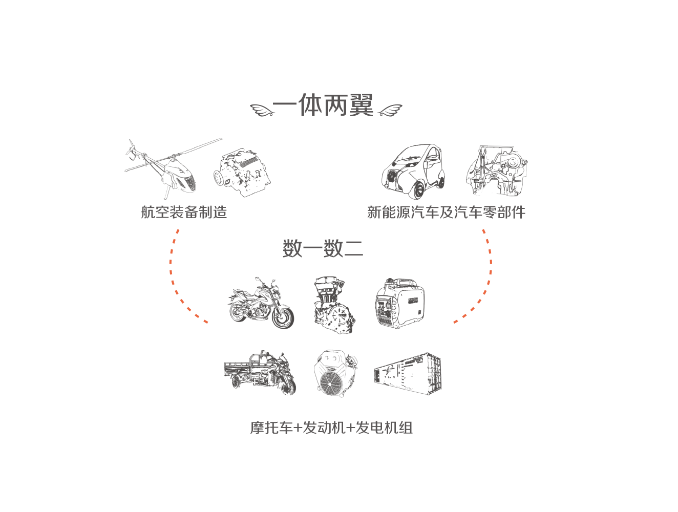 公司自创立以来,围绕清洁动力紧相关领域,不断推进产业横向拓展和纵向升级,已形成“一体两翼”战略格局,“一体”是指摩托车、发动机、发电机组等三大业务;“两翼”是指“航空装备制造”与“新能源汽车及汽车零部件”